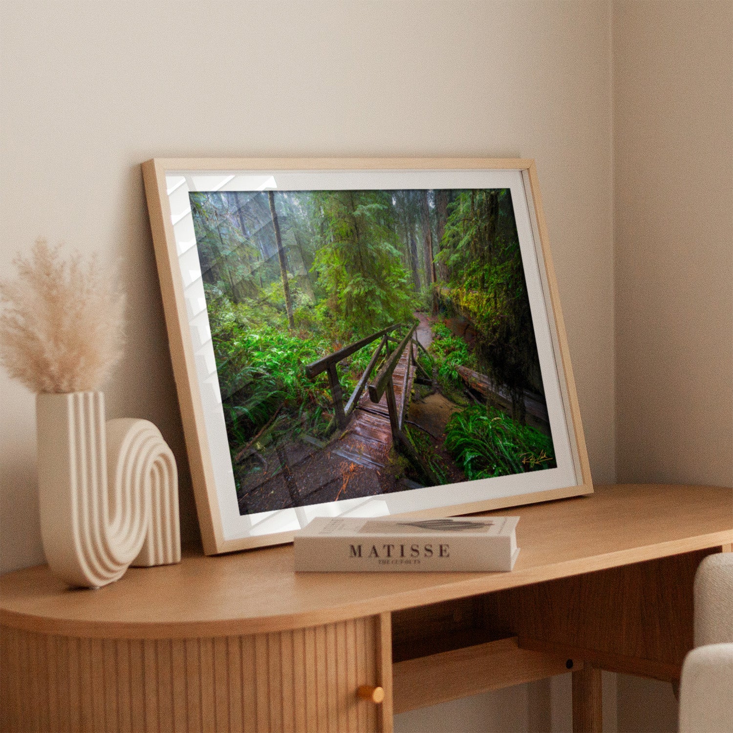 Each print includes a white archival mat and a handcrafted wood frame.