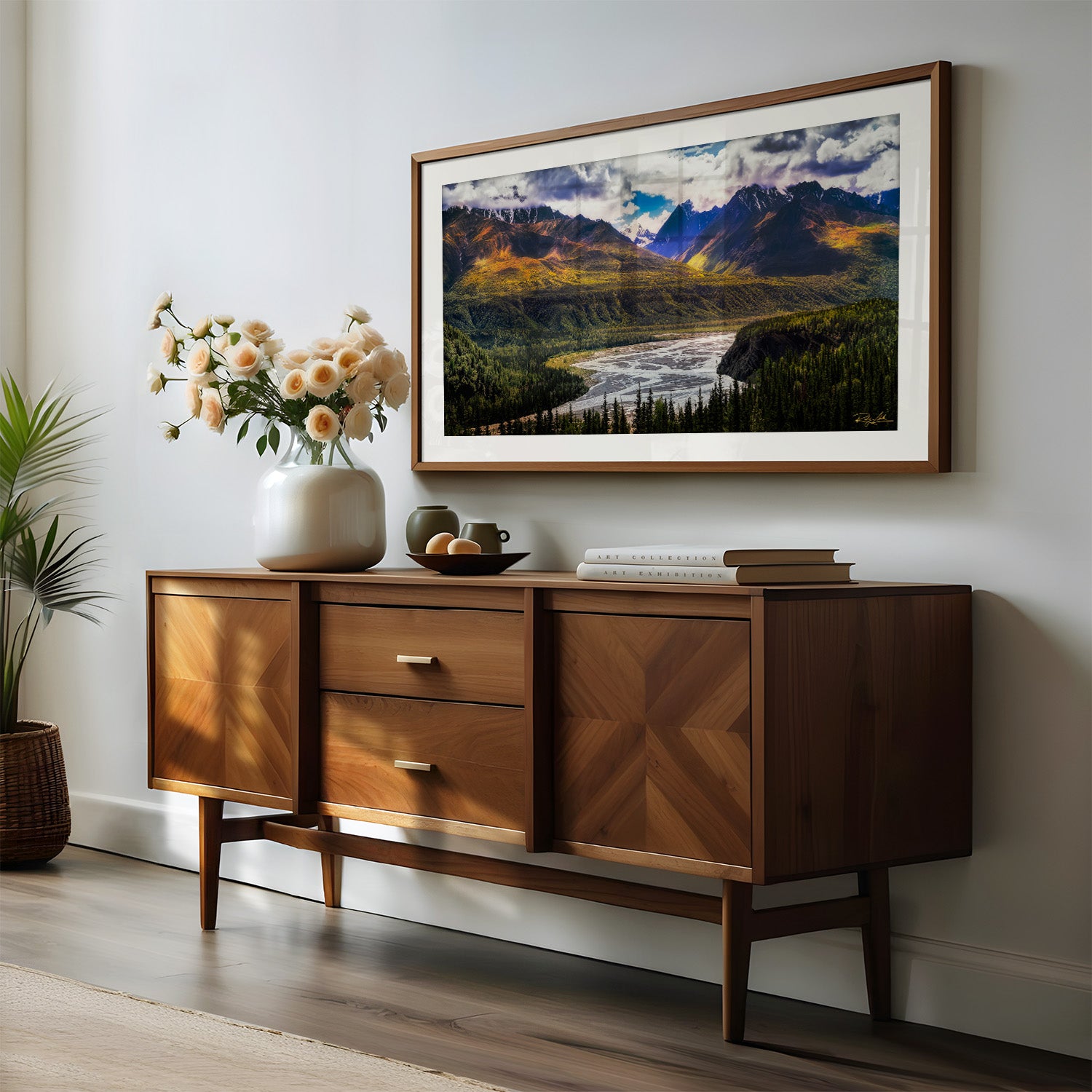 Each print includes a white archival mat and a handcrafted wood frame.